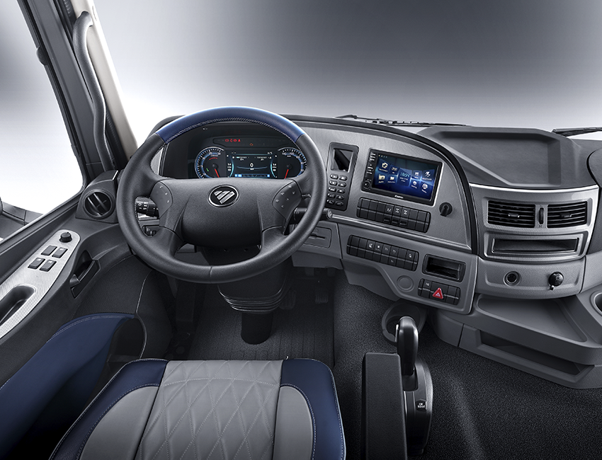 Equipa frenos neumáticos tambor/tambor con ABS, freno de motor Cummins Ibrake y barra estabilizadora delantera para mayor control. Incluye cabina con suspensión, vidrios eléctricos y volante ajustable, brindando seguridad activa y comodidad para el conductor en largas jornadas de trabajo pesado.
